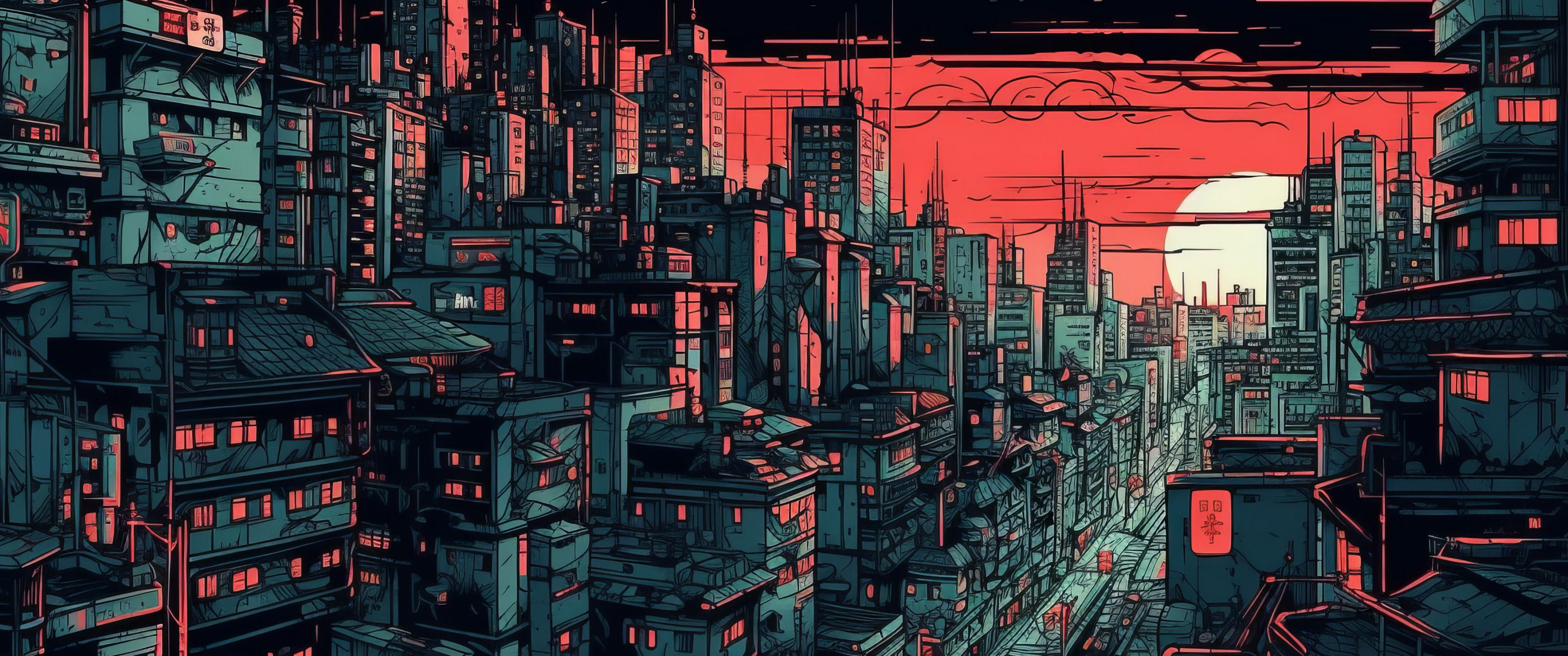 Wallpaper: urban landscape, red - 3440x1440