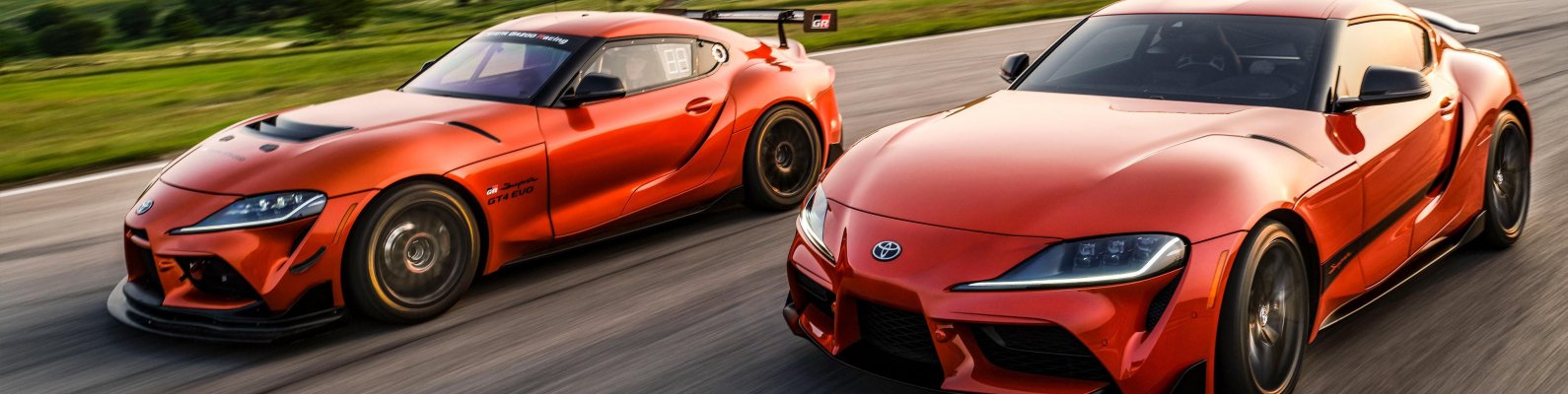 Wallpaper: Toyota GR Supra, red car, speed - 1590x400