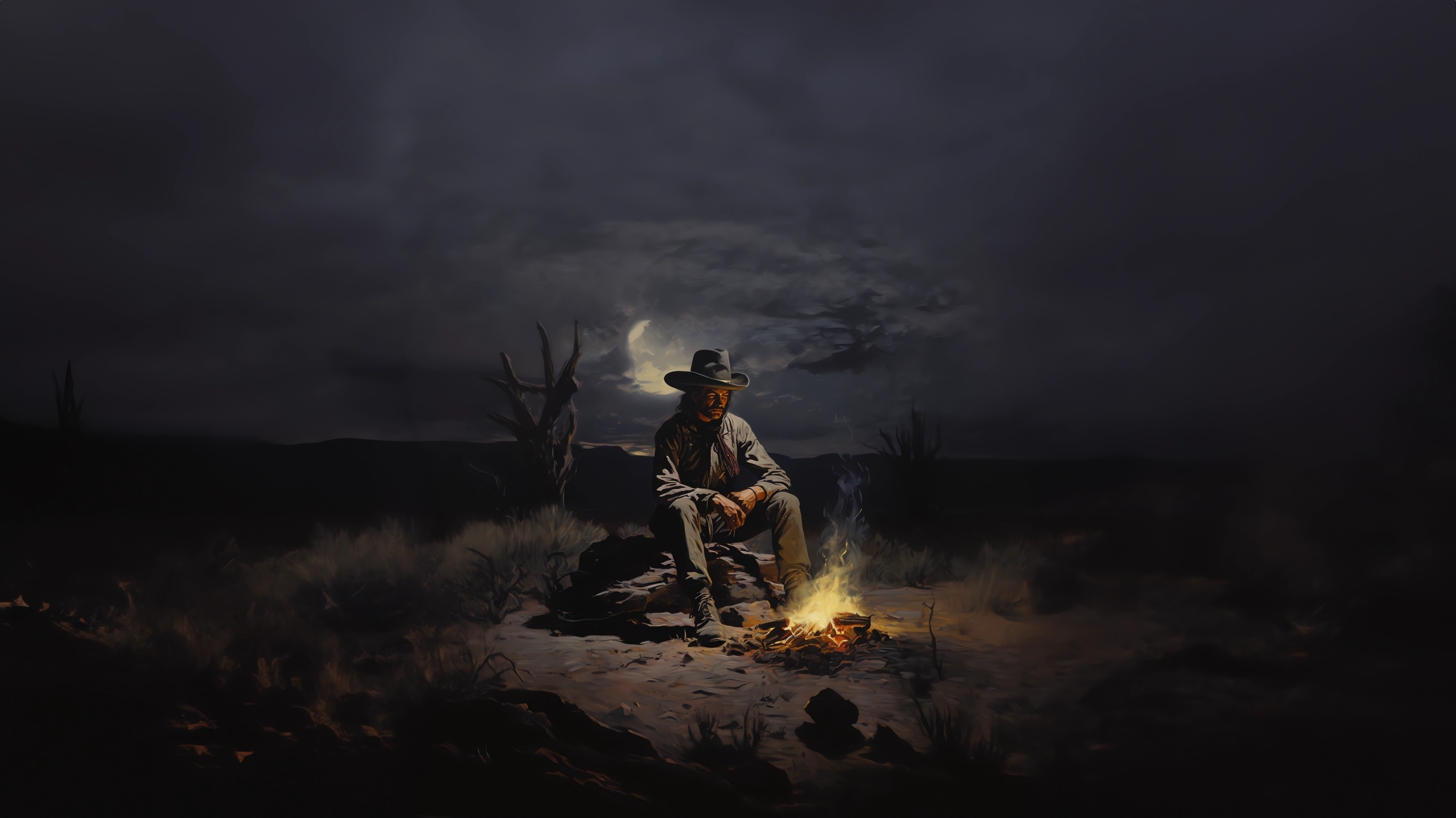 Wallpaper: Wild West, cowboy, night, bonfire - 4468x2512