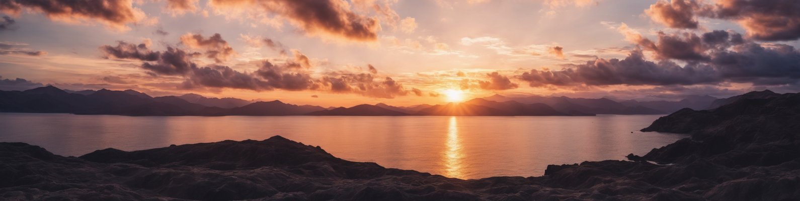 Wallpaper: sunrise, lake, landscape, clouds - 1590x400
