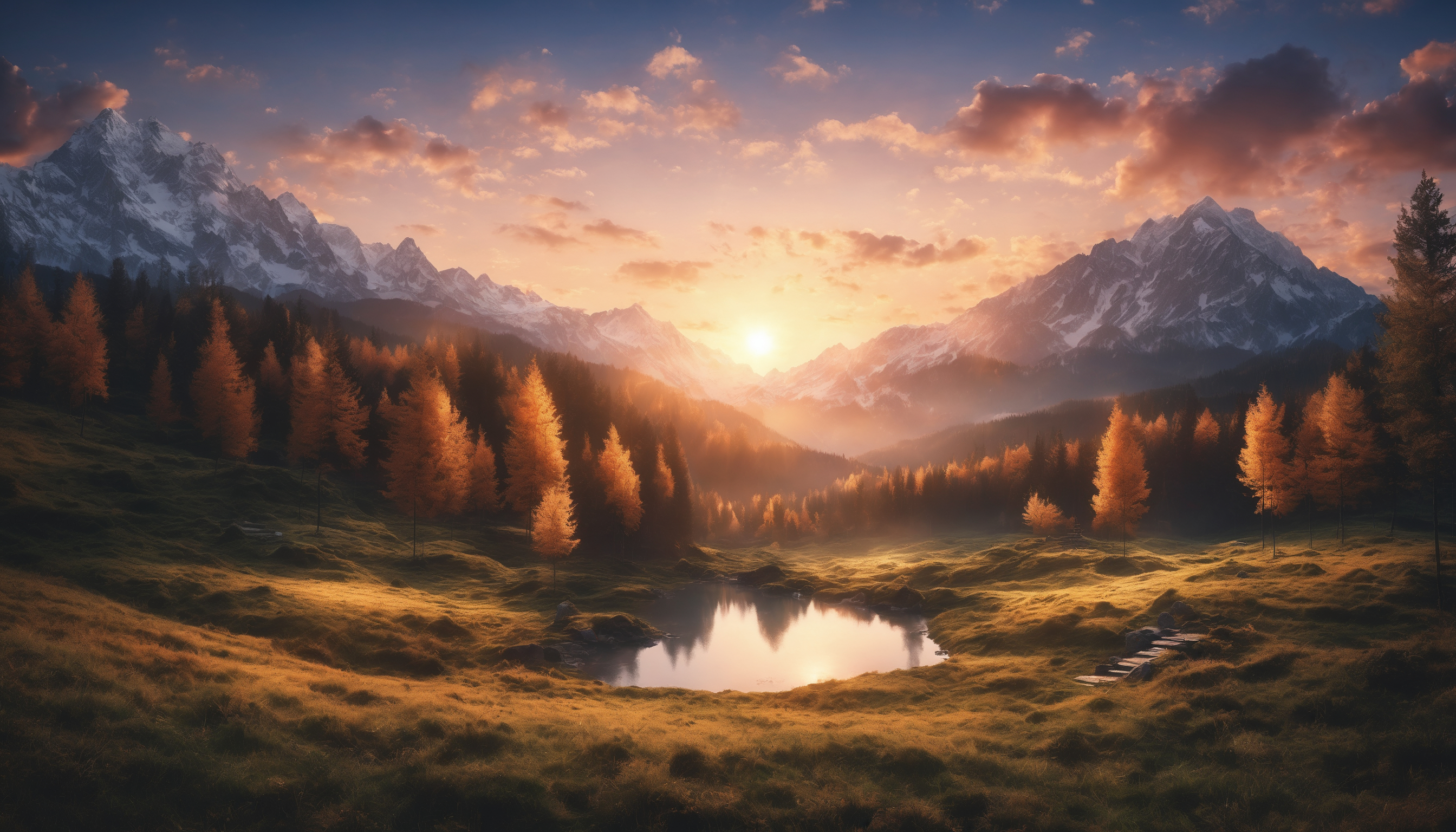Wallpaper: sunrise, landscape, mountains, forest, lake - 2688x1536