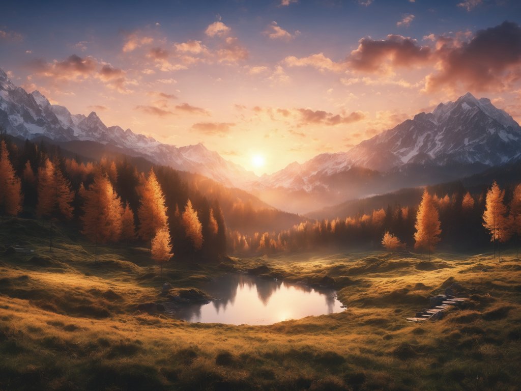 Wallpaper: sunrise, landscape, mountains, forest, lake - 1024x768