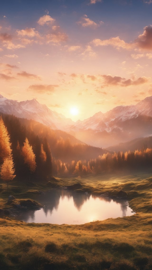 Wallpaper: sunrise, landscape, mountains, forest, lake - 640x1136