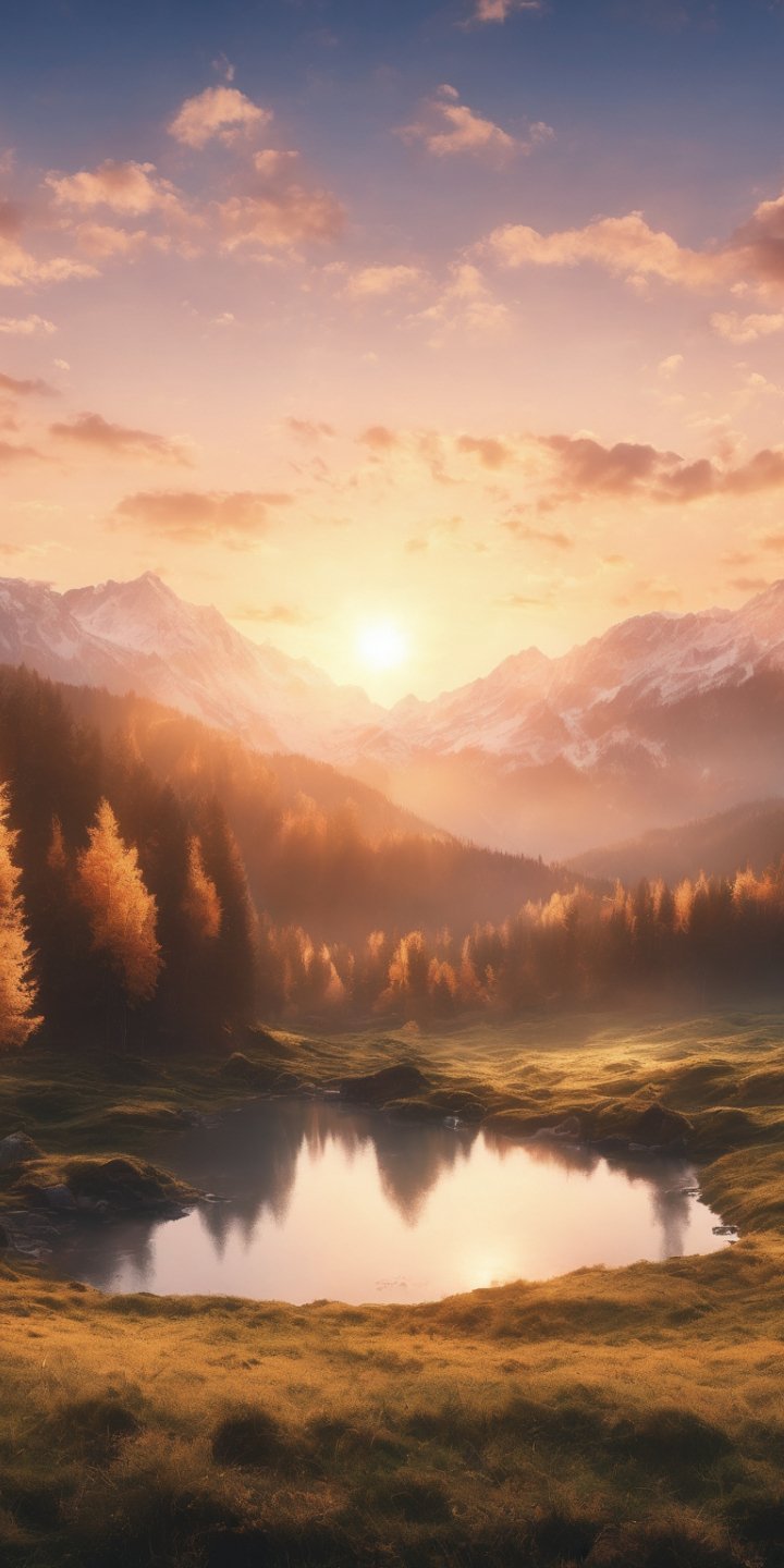 Wallpaper: sunrise, landscape, mountains, forest, lake - 720x1440