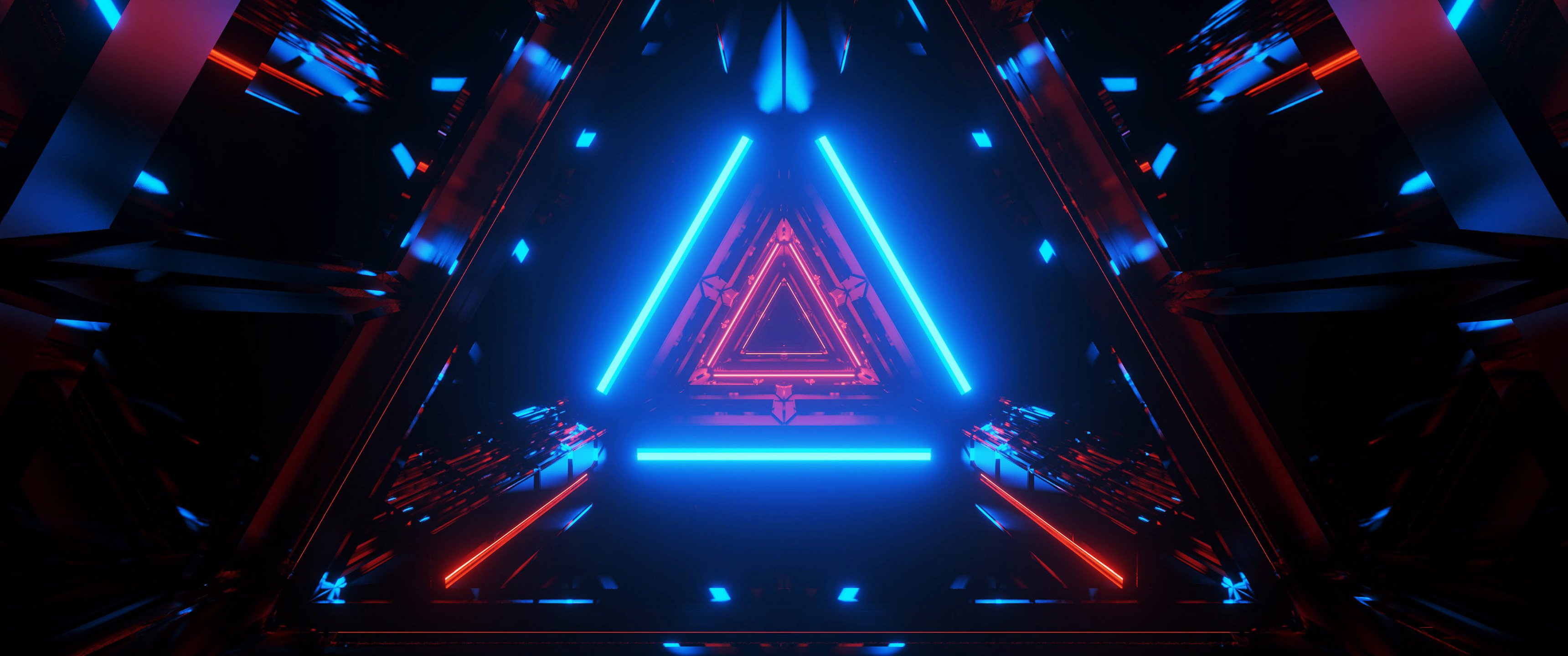 Wallpaper: neon, symmetry, abstraction, triangle - 3440x1440
