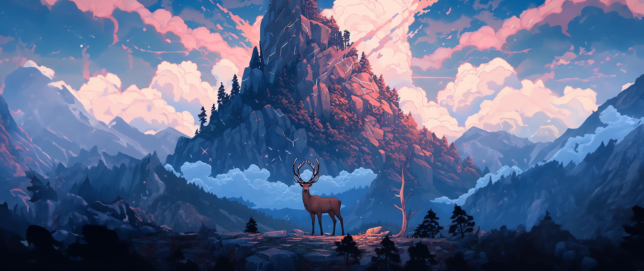 Wallpaper: deer, mountain, landscape - 2560x1080