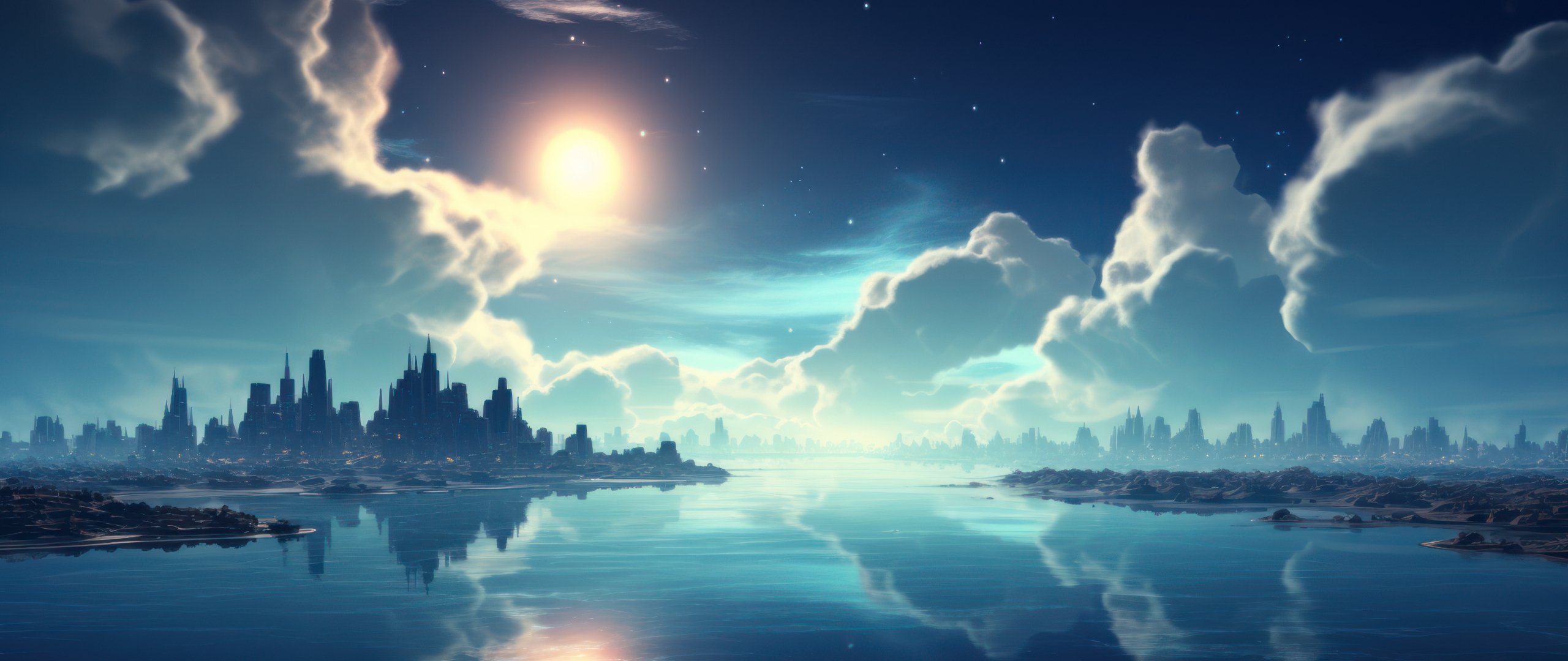 Wallpaper: blue, night, landscape, city - 2560x1080