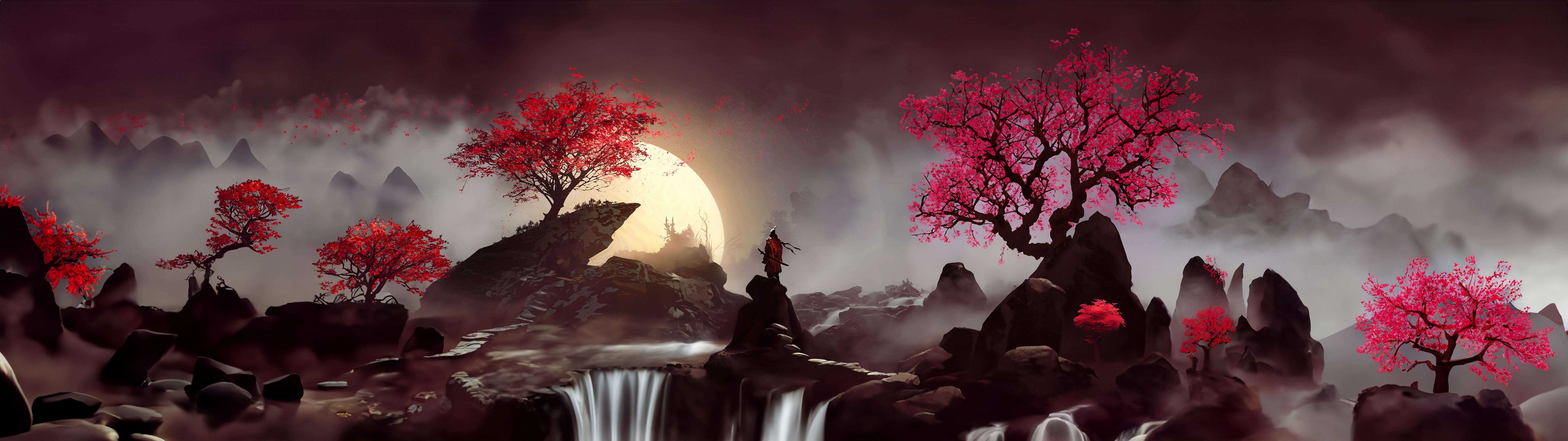 Wallpaper: Japan, samurai, sakura - 7680x2160