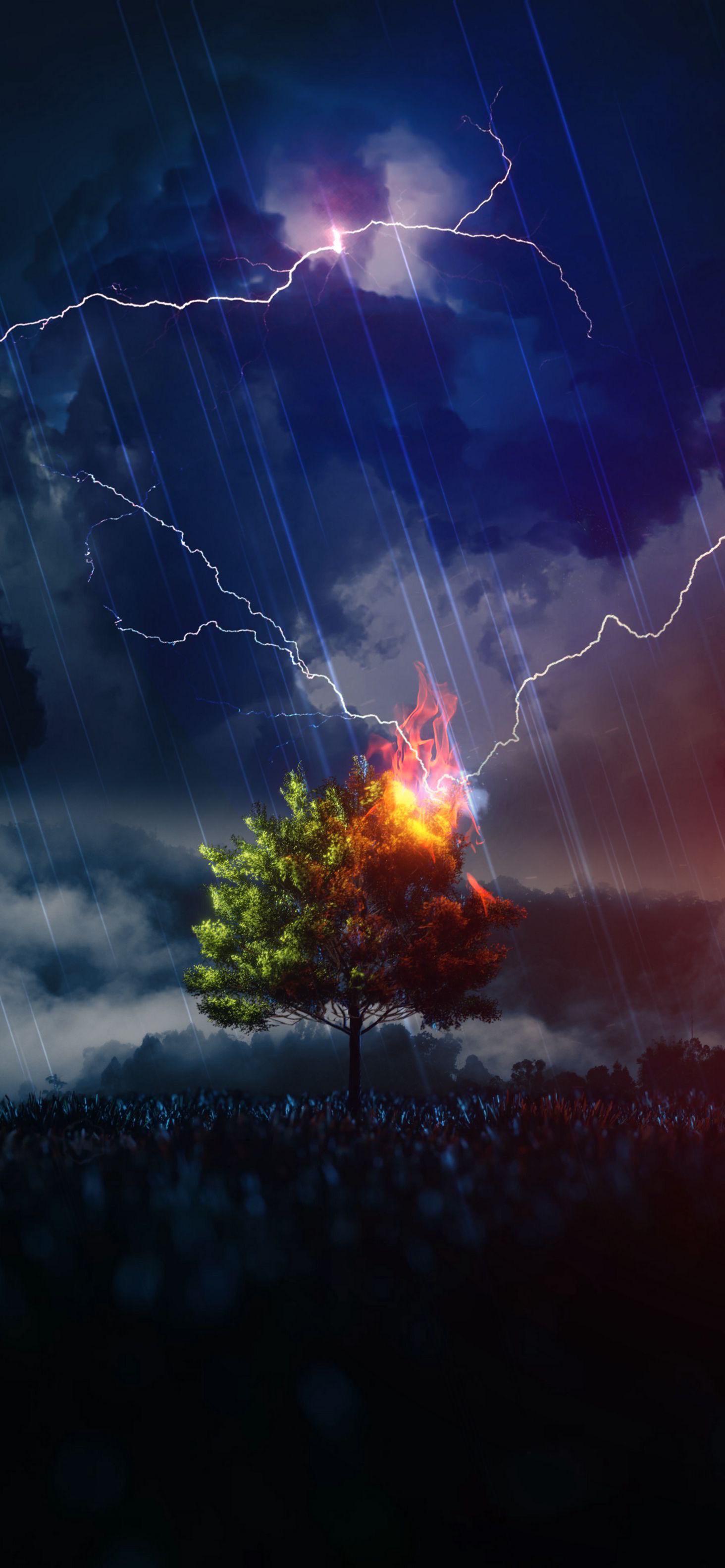 Wallpaper: lightning, tree, night, thunderstorm - 1464x3166