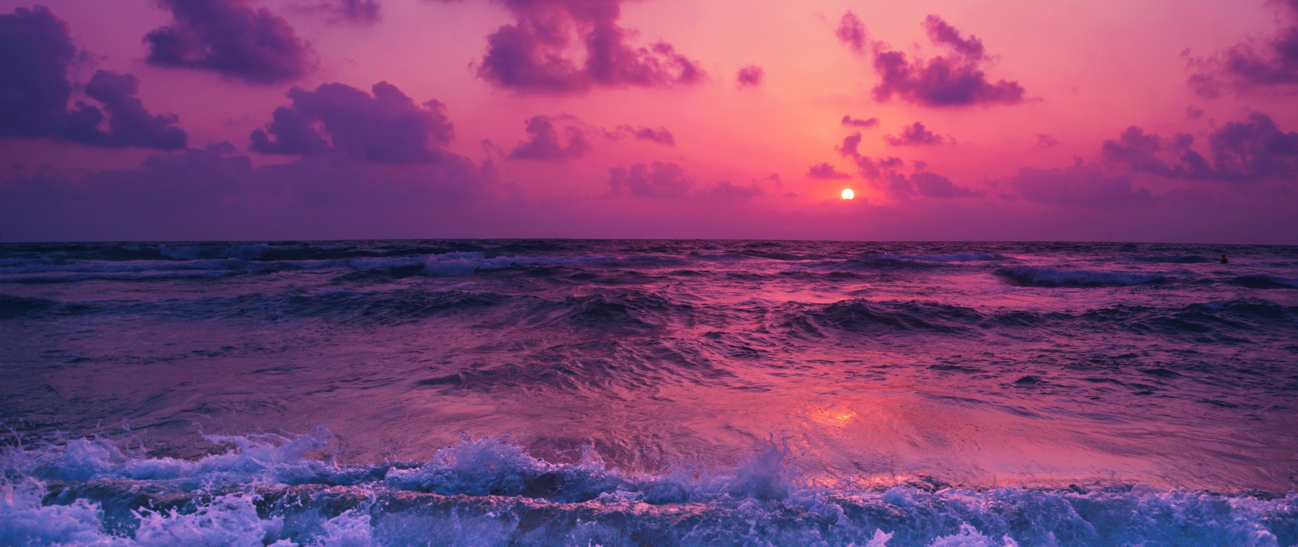 Wallpaper: sea, waves, pink sky - 2560x1080