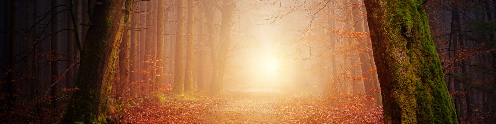 Wallpaper: forest, path, fog - 1590x400