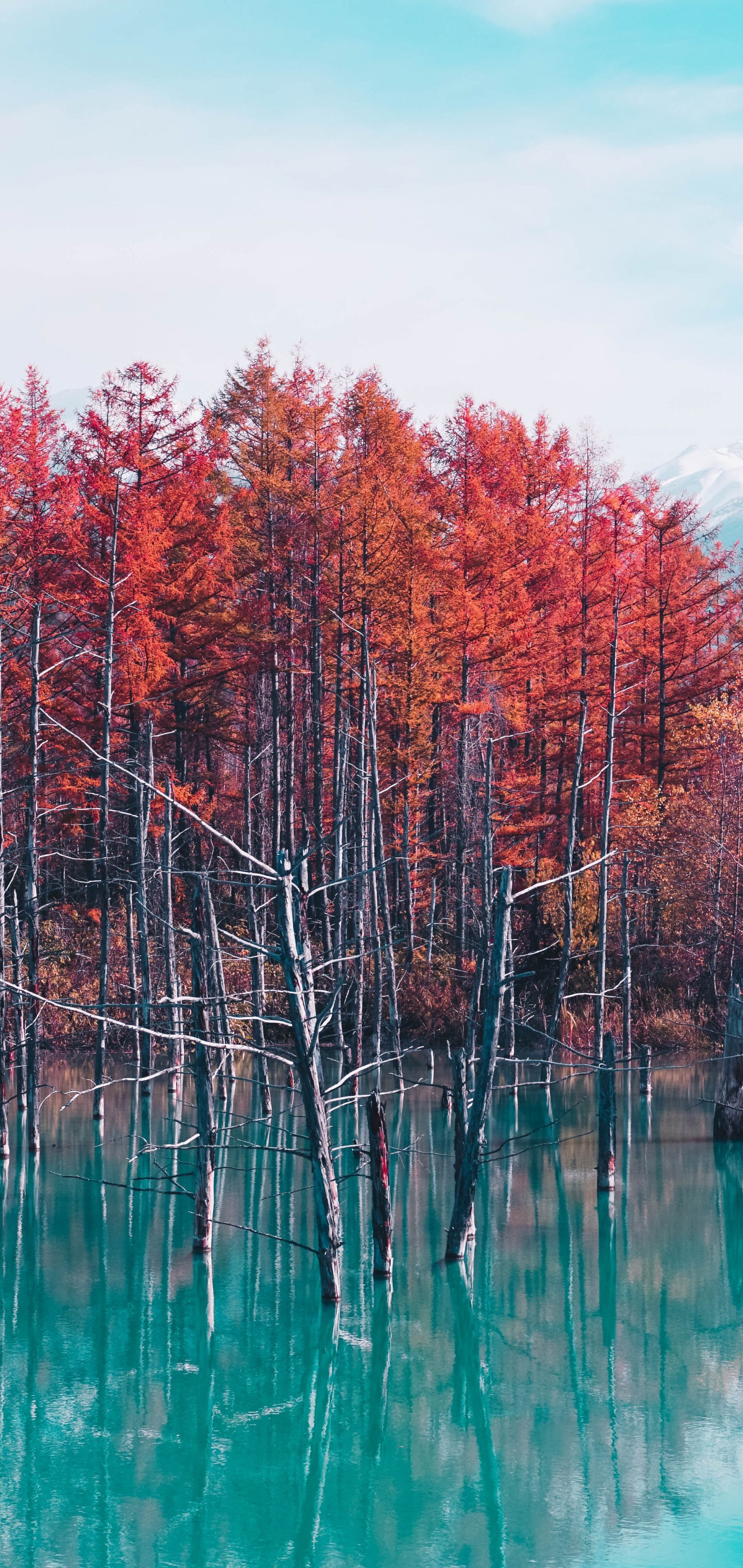 Wallpaper: lake, forest, red - 1440x3040