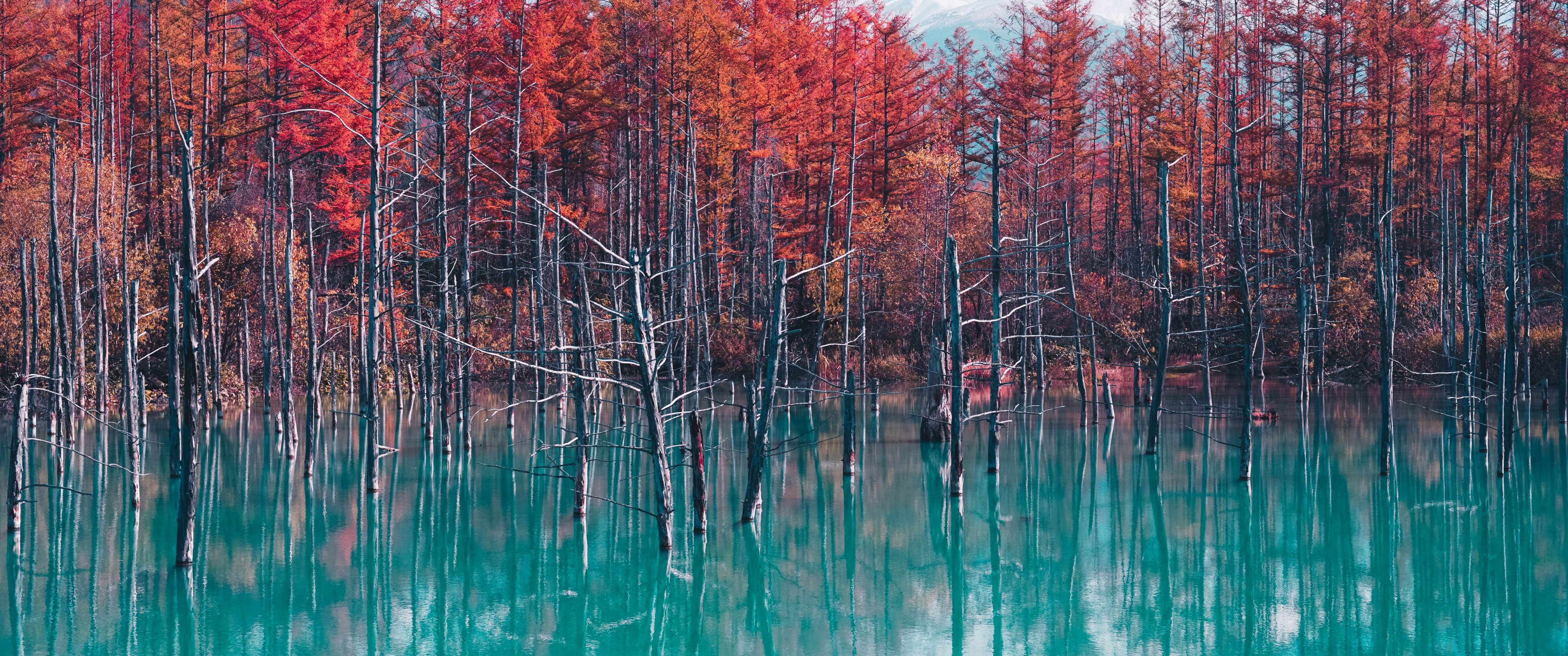 Wallpaper: lake, forest, red - 3440x1440
